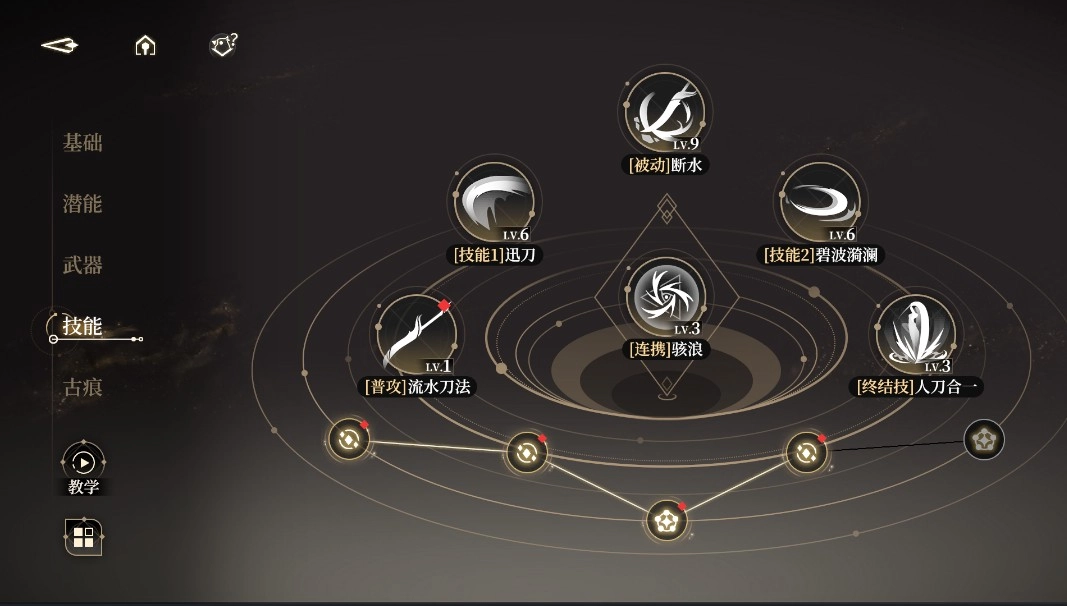 优先把被动技能【断水】升满,因为主要伤害都来自被动强化后的普攻。之后再依次升级技能1、技能2和大招,最后再去提升普攻和连携技能。