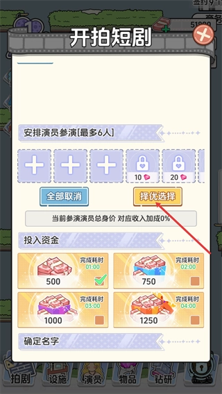 3、通过【安排演员参演[最多6人]】模块挑选演员,点击【择优选择】按钮。