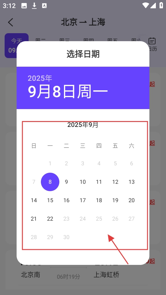 3、进入选择日期弹窗,有2026年9月日历,选要查询的日期,确定后,查看对应日期的车次。