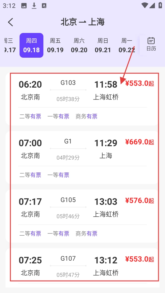 4、选好日期后,回到车次列表页,能看到该日期的车次,如G103、G1等,可查看车次时间、票价及余票情况。