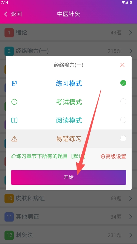 3、确认默认的“练习模式”后,点击“开始”按钮。