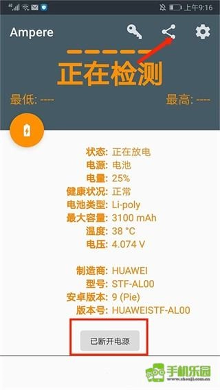 5、接着我们断开电源,选择右上方【分享】图标,可对当前设备电池数据进行不同的方式进行分享;