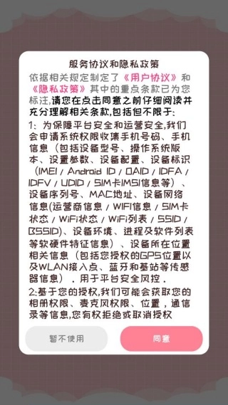 1. 初次使用时需要查看服务协议和隐私政策,点击同意才可以继续使用。