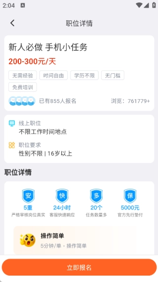 2、在岗位详情页面中可以了解各类工作,可以随时立即报名;
