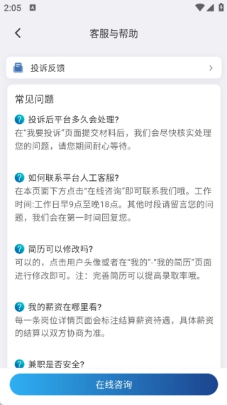 4、在客服与帮助页面中可以了解常见问题,可以随时在线咨询。