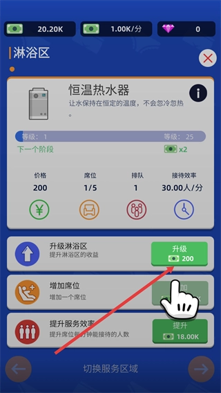 2、进入【淋浴区】界面后,找到【升级淋浴区】这一选项,接着点击【升级】按钮,以此来提升收益。