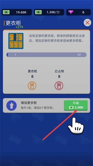 4、进入【更衣柜】界面后,找到并点击消耗【5.00K】货币的【升级】按钮,以此提升更衣柜容纳顾客的能力。