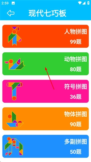 2、在现代七巧板的分类页面挑选目标拼图类型,随后进入对应的拼图关卡页面。