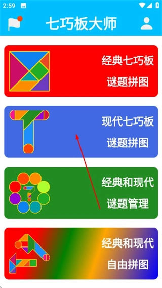 1、在七巧板大师首页找到并点击“现代七巧板”选项,即可进入现代七巧板的分类页面。