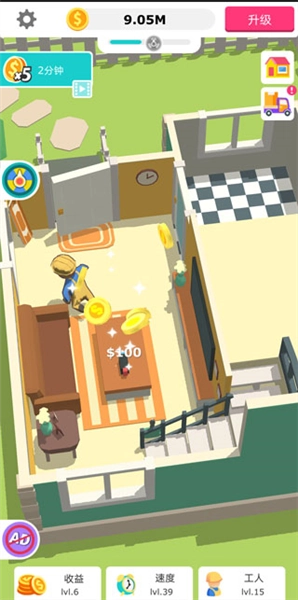 3、开工后,房子每完成一项装饰就可以获得一笔金币收益,可以在右上角升级。