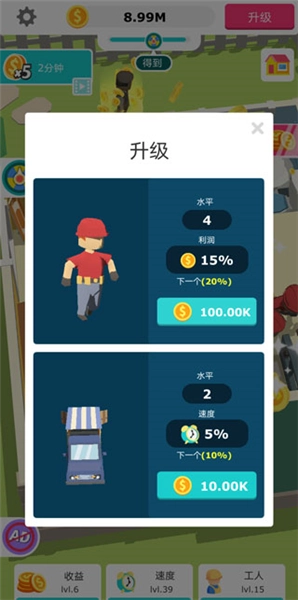 4、当然,作为老板你也可以升级你的工人,让他们每次获得的金币更多。