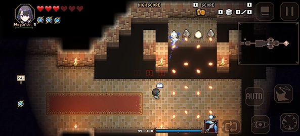 这是一款弹幕射击类游戏,操作方式为左摇杆控制移动、右摇杆进行瞄准。玩家每次进入游戏,都会面对随机生成布局的地下城,开启一场全新的冒险。