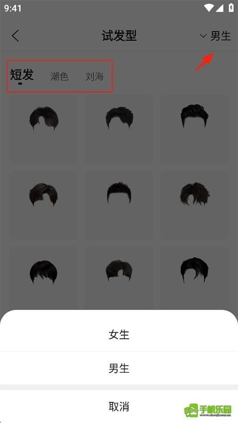 2、在右上角点击切换男生/女生性别,下方选择发型类别;