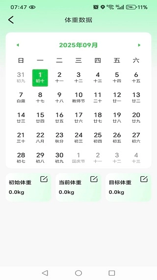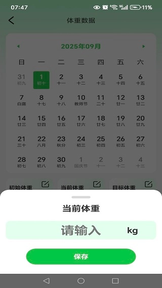 2、点击进入记录页面,可以按照日历,添加你每一日体重数据。
