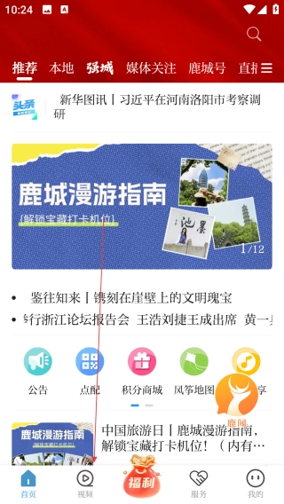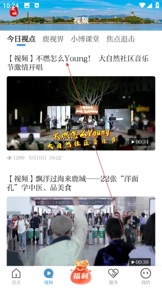 是鹿城区打造的集新闻资讯、政务服务、生活便民于一体的综合性本地服务平台,秉持“新闻+政务+服务”理念,致力于为用户提供精准、高效的城市生活解决方案。它24小时更新本地及全国新闻,涵盖时政、民生、经济等领域,同时整合交通违章查询、公交实时到站、酒店预订、医疗挂号等多项便民服务,让用户一手掌握鹿城动态,轻松享受智慧生活。1、打开掌上鹿城,点击【视频】。