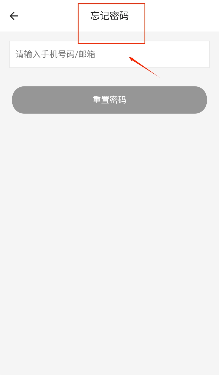 2、 找回密码无需慌乱,在登录页面点击蓝色的“忘记密码?”选项即可跳转至新界面,该界面顶部设有返回箭头与“忘记密码”的标题,接下来只需在白色输入框中填写注册时使用的手机号就可以啦。