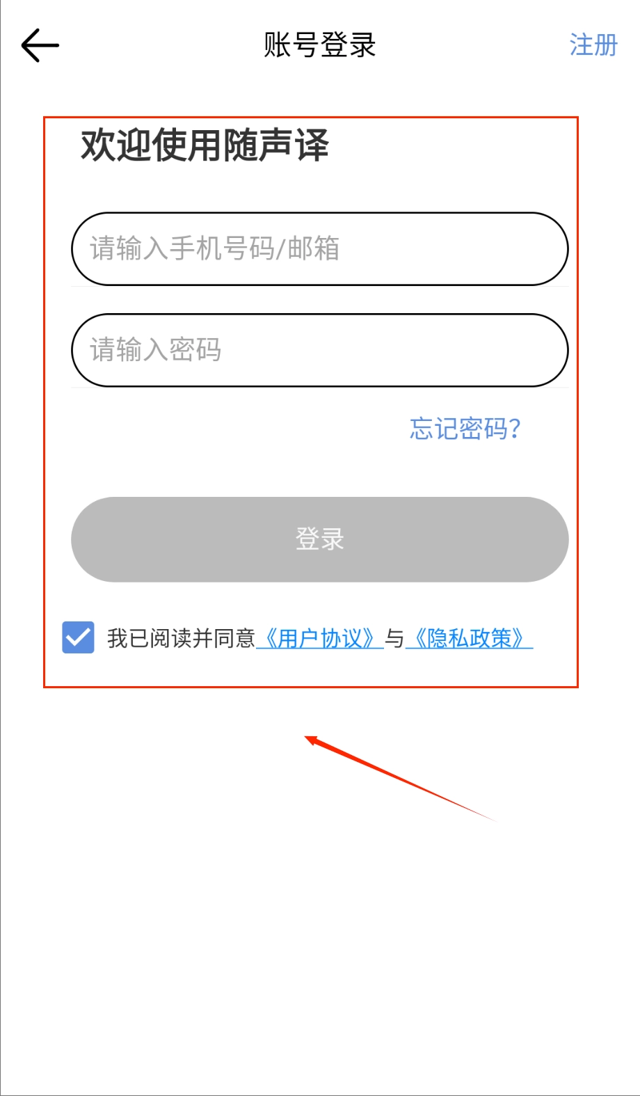3、账号登录特别方便,打开后能看到“欢迎使用随声译”的提示,第一个输入框填写手机号或邮箱,第二个输入框输入密码(还可以点击眼睛图标来检查输入的密码是否正确)。
