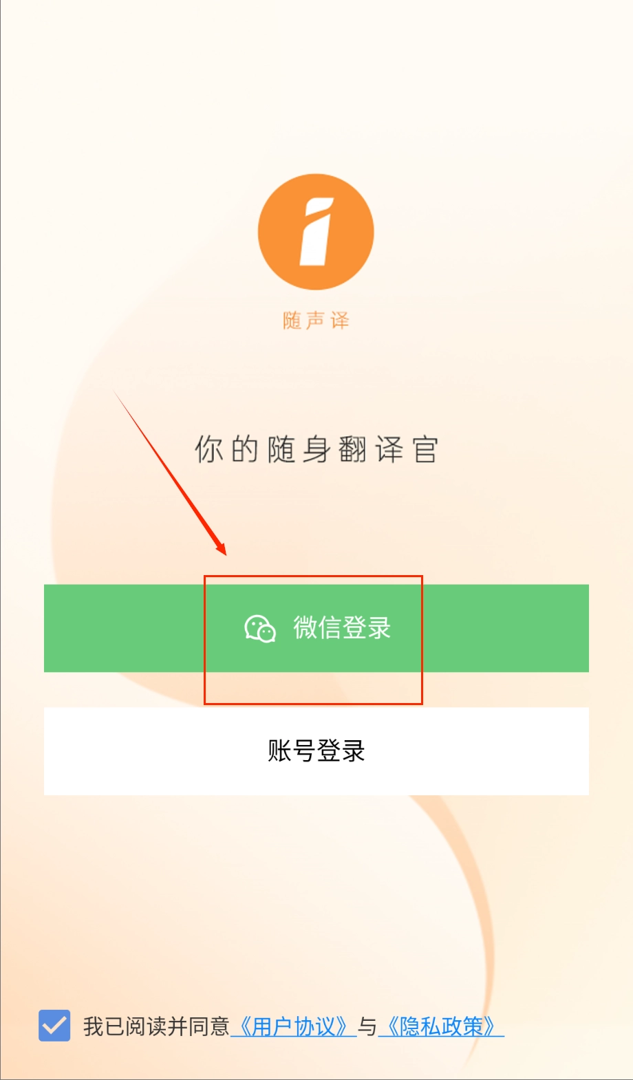 4、用微信登录会更快捷哦,在启动页面可以看到橙色的“随声译”图标以及“你的随身翻译官”这句标语,直接点击绿色的“微信登录”按钮进行授权就可以啦。