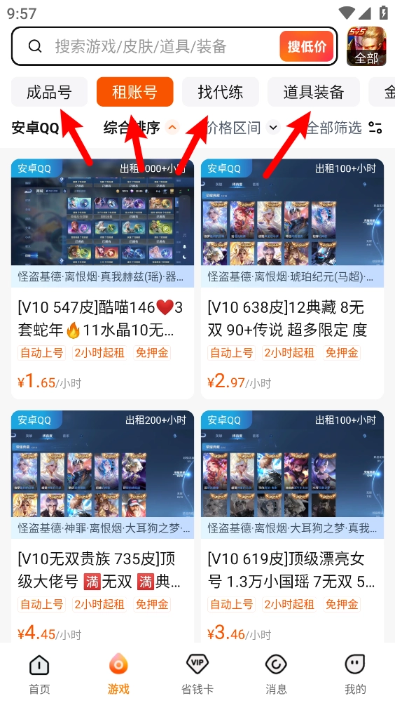 2、热门账号低至1元/小时,新用户注册即享租号券