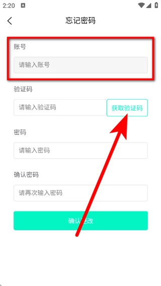 4、在忘记密码页面,输入账号,点击获取验证码。