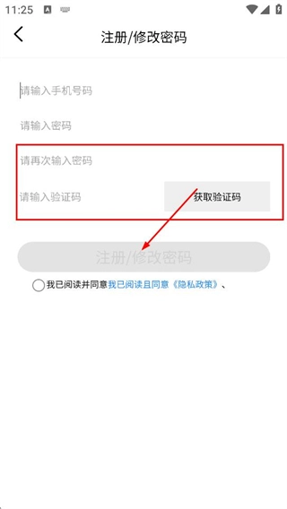 4、进入注册或修改密码页面后,接着填写密码与验证码,随后点击注册按钮,即可完成账号注册的全部流程。