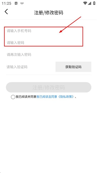 3、在注册/修改密码页面,先填写请输入手机号和请输入密码对应的信息,进行下一步。
