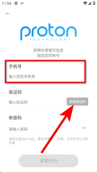 3、在账号找回页面,输入手机号,点击获取验证码。