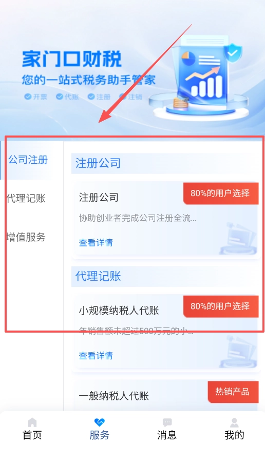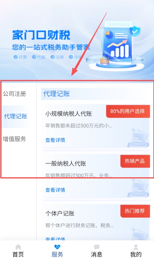3、服务选择功能集成公司注册代理记账变更注销等多种套餐,用户可浏览详情并自主对比后下单享受专属服务。