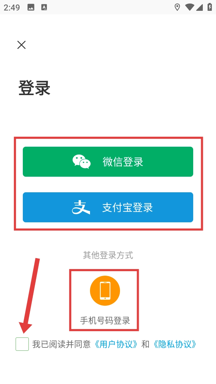 2、用户在登录界面操作时,需先点击【已阅读并同意】,之后再从方框内的登录方式中自行选择即可。