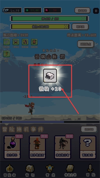 4、完成拾取后将获得【铁块+20】类资源,这类资源可用于后续冒险中的道具制作或属性提升。