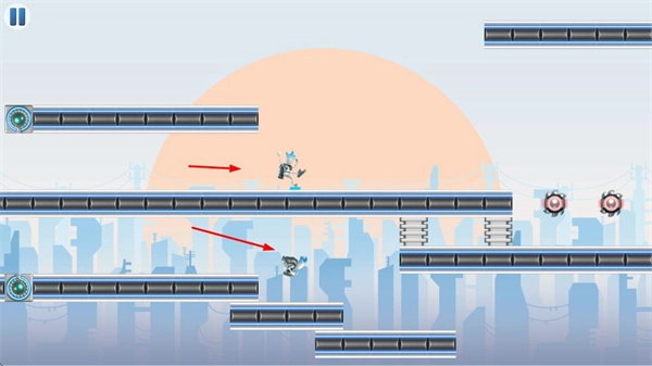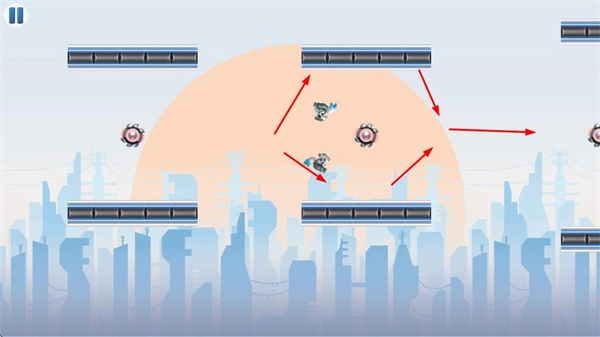 1、进入游戏界面后,操控机甲在多层平台间移动,避开障碍推进进程。
