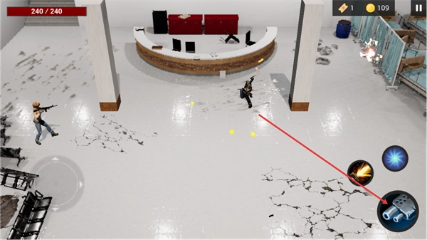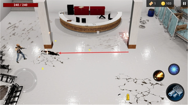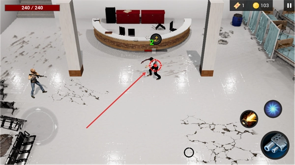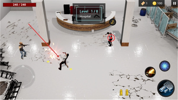 1、在Hospital场景的Level1/8关卡里,玩家需要操控角色对僵尸发起攻击,通过消耗弹药来推动战斗进程。