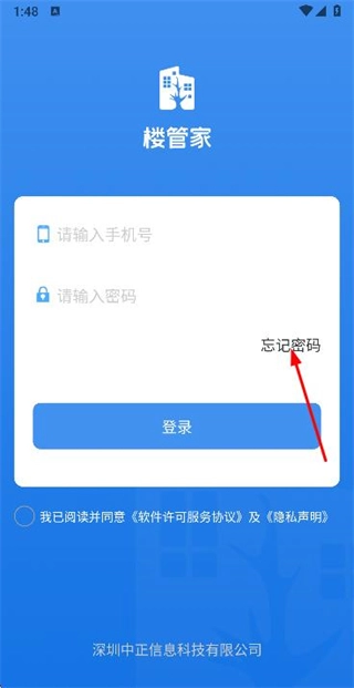 1、在楼管家登录页面点击忘记密码选项,进入忘记密码页面。