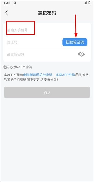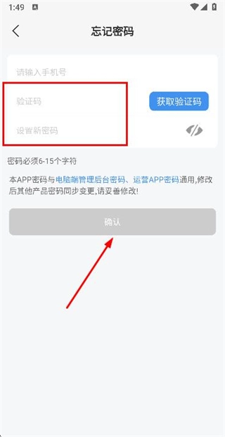 3、在忘记密码页面输入验证码、设置新密码后,点击确认按钮完成密码修改。