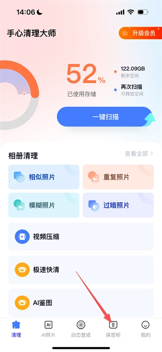 1、在清理页面点击保密柜选项,进入保密柜功能页面。