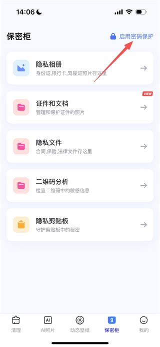2、在保密柜页面点击启用密码保护选项,进入设置密码页面。