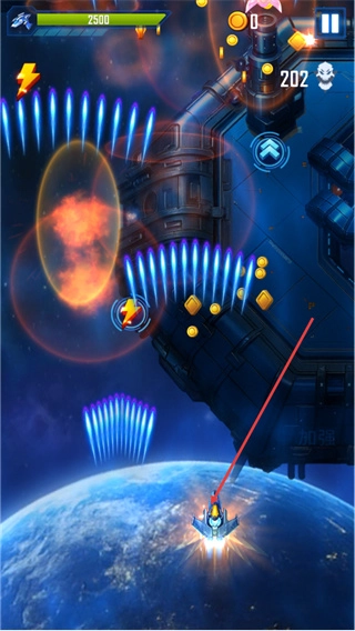 3、战斗过程中,通过界面上的方向按钮操控飞船移动,躲避敌方子弹的攻击,并且收集场景内的道具以提升自身的战斗能力。