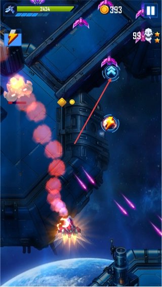 2、在关卡战斗环节,玩家需要操控飞船避开敌方的攻击,同时发射弹幕进行反击,收集场景里的金币,也可以点击加强按钮来增强飞船的火力输出。
