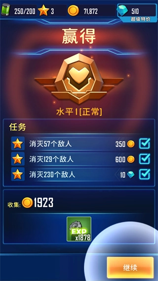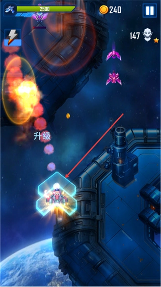 4、战斗过程中若拾取到升级道具,会弹出升级提示,飞船的能力也将随之得到提升。请继续战斗,积累更多资源,以此推进本关卡的进程。