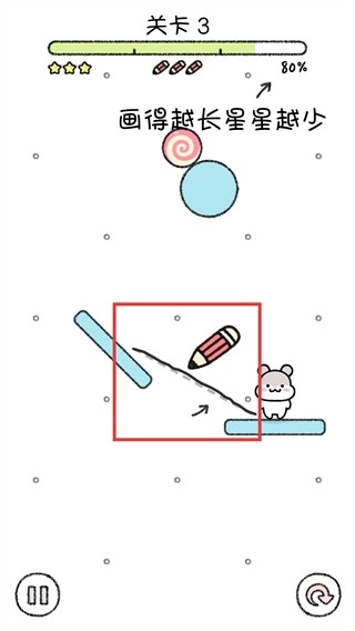 1、【关卡3】的提示是【画得越长星星越少】,红框标出了画线区域,要画短线条引导糖果到仓鼠那里才能拿到高星。
