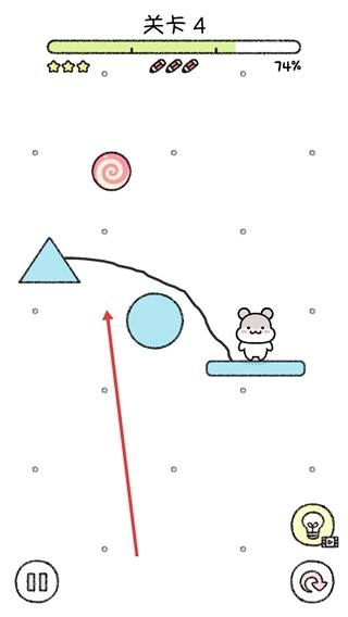 3、【关卡4】红箭头指向蓝色三角旁画线区,绘制轨迹引导糖果向仓鼠所在平台移动。