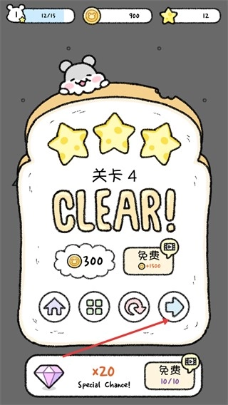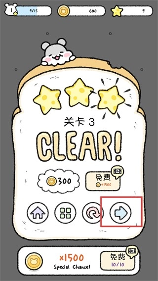 2、【关卡3】通关界面显示,红框指向向右箭头。