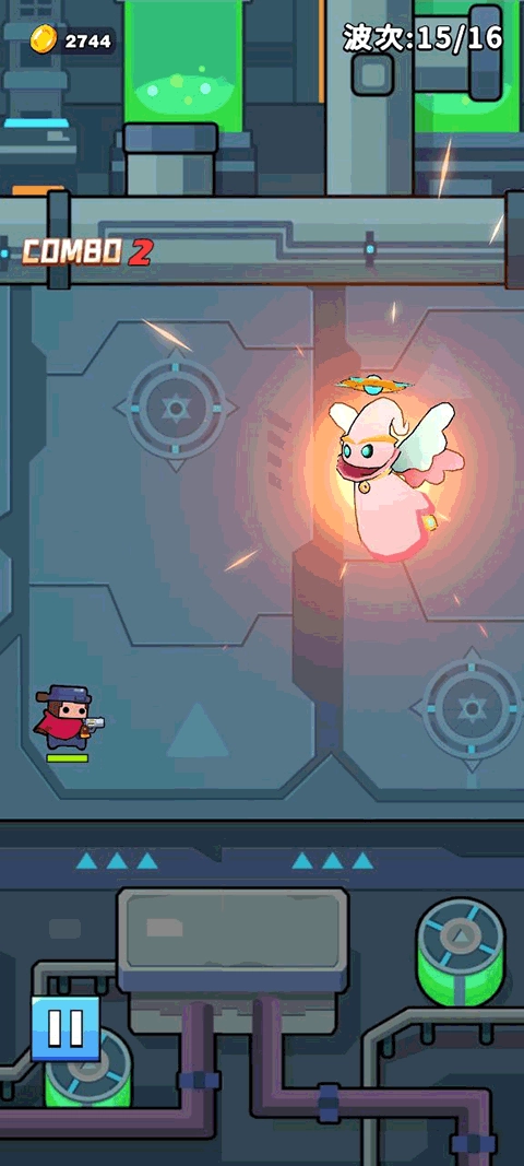 1、会遇到不少敌人,这时我们点击一下屏幕,角色就会完成一次跳跃,同时开一枪,子弹会朝前方飞去,我们要做的就是用子弹消灭敌人,把敌人都击退就能获胜了。
