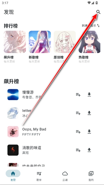 1.启动摩比音乐后,能看到软件内设有最新的飙升榜、新歌榜、原创榜和热歌榜。接着点击界面右上角的放大镜图标。