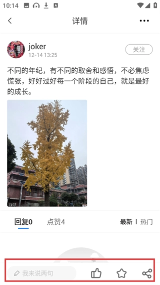4、在动态详情页点击底部互动按钮,就能对该动态进行评论、点赞等互动操作啦。