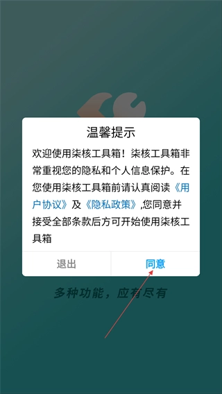 1、请仔细阅读【用户协议】与【隐私政策】,点击【同意】按钮后即可使用柒核工具箱。