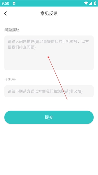 4、在意见反馈页,填写问题描述与手机号,完成后点击【提交】反馈内容。