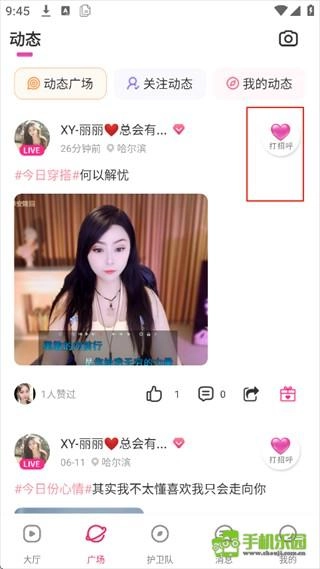 4、除此之外软件内还有广场和护卫队板块广场看到喜欢的可以点击打招呼