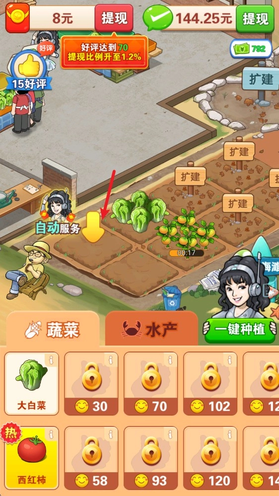 在游戏里,点击空着的土地就能开展种植,以此给菜市场供应足够的货物。