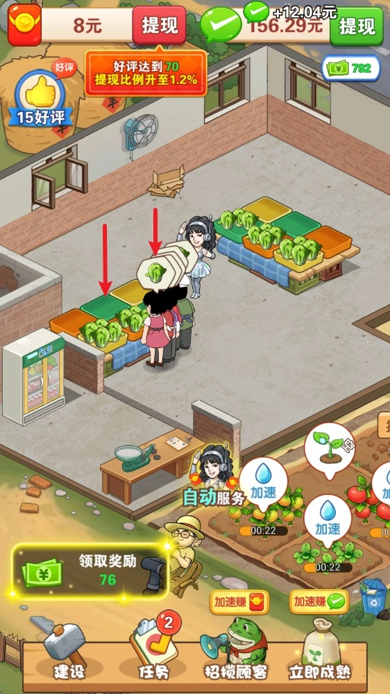 收获后的货源会被投放到菜市场里,点击顾客头上的图案就能开展销售。